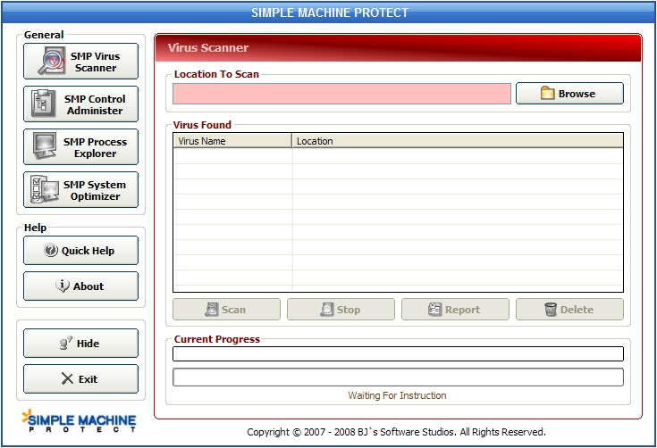 Simple Machine Protect is portable anti virus software for your Windows Operating System, built to remove certain variant of virus, worm, trojan and spyware from your computer. Simple Machine Protect is free to distribute, and free to use. Simple Machine Protect was designed to be a simple, open source anti virus scanner.