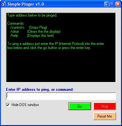 This is a simple pinger program. It shows how to ping using DOS commands (ping.exe in windows). Shows how to use dos commands so you can use any DOS command in VB. Its just something i threw together for a friend so he can ping without going threw the dos prompt. Please vote for me. Thanks :)