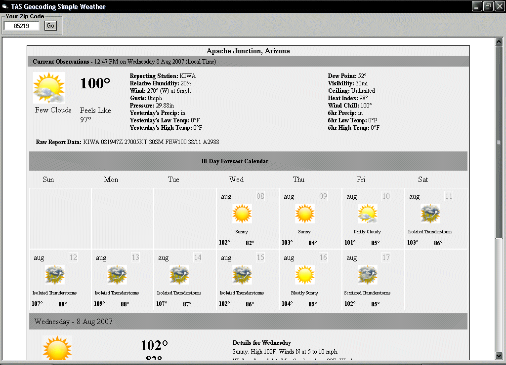 I have seen a lot of people put together parsing weather information programs pulling data from pro websites that usually bomb inside of a week So I figured I would make an attempt at the same kind of project and see if I could do any better. LOL This program works by first submitting the users zip code to a geo database and returning XML then parses the data URL from the XML to finally gather and then filter the weather data the way it should be done. Like the name says it was a simple project, hope you like it.