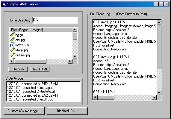 Version 2 of my simple webserver (The code is simple, but the server can do much more) Features include Root directory customizing and a better HTML editor, Custom 404 error messages, Simple activity log, Full Client Log (what the browser sends to the server), and IP address blocking. If you like this, please vote for me ;)