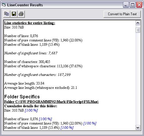 This program will count the number of lines, characters, etc, of a specified list of files in a given folder (and optionally all of its subfolders). I plan to add more statistical data later, such as a list of the "top ten" files, by number of lines. The line counting method is simple: it counts all lines that contain any non-whitespace characters. It also counts the number of pure comment lines (those that start with a ' and contain no code) and displays that number. There are probably better counting algorithms out there but this project is somewhat tailored to the kind of coding I do. Among other things, this module also demonstrates how to use the Browse For Folder dialog (Windows API--thanks to Dev Ashish) and the FileSystemObject to recursively search for files. Please vote, as I'm just plain curious :P. --Mark