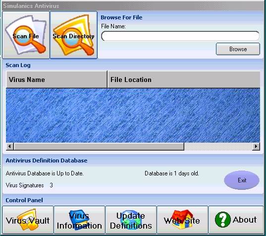 Simulanics Antivirus -Currently Scans Files for Virus Signatures...will soon be able to "heal" the infected file (already underway)