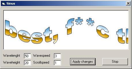 This recreates (in a way) those sinusscroll effects that were very commonly seen in the old demo days on the amiga. I find it hard to see any use of this code but it might be fun for someone. Plz comment!!!