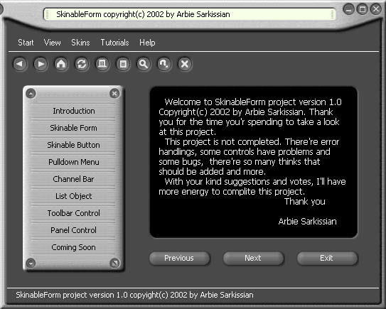 This project has several ActiveX controls which gives you the ability of making skinable programs (programs that can change skin such as Winamp), easy as it possible! Simply add the ActiveX control to your project and write only one line of code and then walla... you have a skinable program. Beside that you can chose between several skins that I have made for this project.