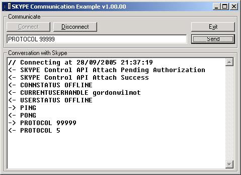 Demonstrates how to talk to the Skype API to develop application using Skype. The communication uses the windows messaging subsystem. You need to have Skype loaded. The same sample is available in C#.