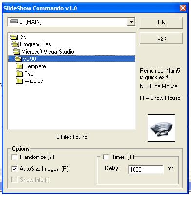 the best slideshow prog out there. resizes image to screen (proportional), uses timer delay. NumPad navigation!. ul never need another slideshow program again!!!! (the hotkeys are the key!!!)