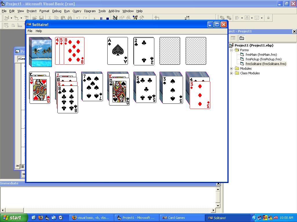 Solitaire! This is a remake of the solitaire game that comes with Windows. I'm pretty sure there aren't any bugs, at least none that I've come across. Updated: added options, scoring, time and the ability to choose your deck back! The only difference between mine and Microsoft's now is undo.