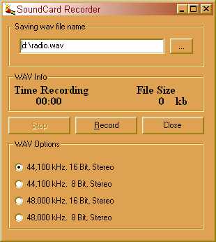 It records sound from the sound card. Great for recording streaming music then convert to mp3 and burn to CD.I got the original code from VBC which was taken from two other pieces of code here. I have added some features.