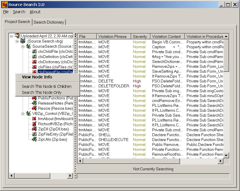 I've added ZIP capability to Source Search. Now you can just drag and drop any ZIP file into it and magically the file is unzipped and the VB files are scanned. There are also some new popup menus for the project list. ******* Ever worry that the code that you are downloading is malicious? Verify the code before you run it, with Source Search. Just drag an drop your project file onto the form and let Source Search check out the code against a customizable search dictionary. It will also enumerate through your project file to make sure that all referenced components are scanned. I have included a basic dictionary with the project. If anyone can find other terms to add to the dictionary, email me at [email protected] and I will add your suggestion to the dictionary. Also, send me an email at the same address if you would like to receive dictionary updates by email. Please leave feedback and vote!