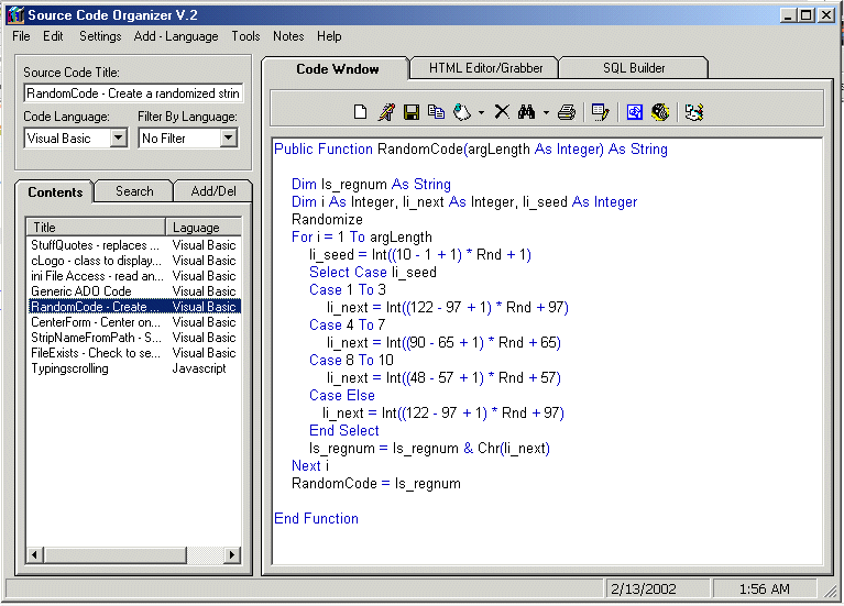 SCO is a code snippits organizer built-in with HTMl editor ,SQL builder,Database scanner and a file viewer.Although, most of the code was taken from VBC but I did a lot of changes and added more features.I would like to give credit to Mark Joyal for his excellent code.BTW I don't expect a vote but if you do it will be appreciated.
