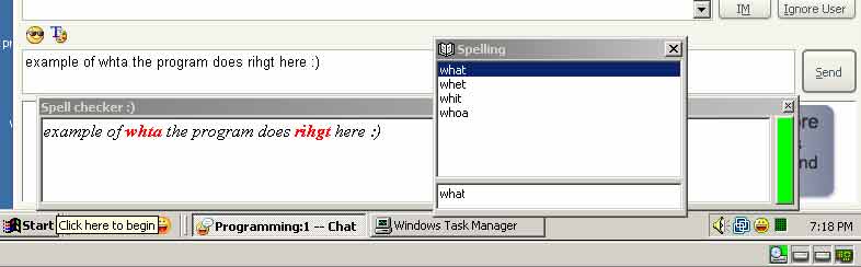 Spell check any text chat window you have open, (Ex: look at screenshot). works with almost all windows. By just clicking on a windows text field it gets the hwnd and gets the text from it. If you right click on a highlighted word it can be added or it can give you suggestions. I put in a 1024 letter limit so it would not slow down while your typing, you can change it to be what ever you want in the code.