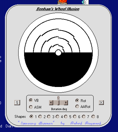 Spinning Illusions by Robert Rayment. (Small change, hopefully more stable on other OS than Win98) Just a bit of VB doodling, 8 shapes with odd effects. [ Shaped form & picbox, +/- rotation <-> anti-alias rotation, VB<->ASM, Res wav ]. Zip 100 KB, Win98.