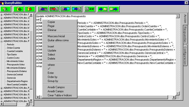 This SW allows you to create complex SQL sentences, working with the Dictionary of the Data Base in use. This sentences can be saved to use it later.
