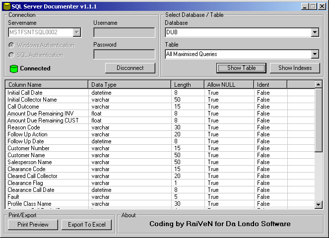 SQL Server Documenter can display, print and export to Excel a complete overview of all fields and indexes in a table. This started as a "hello world" type of thing for SQL-DMO and this is the result. It's great for debugging or documenting your databases (that's why I wrote it ;-)). Try it and any suggestions are always welcome.