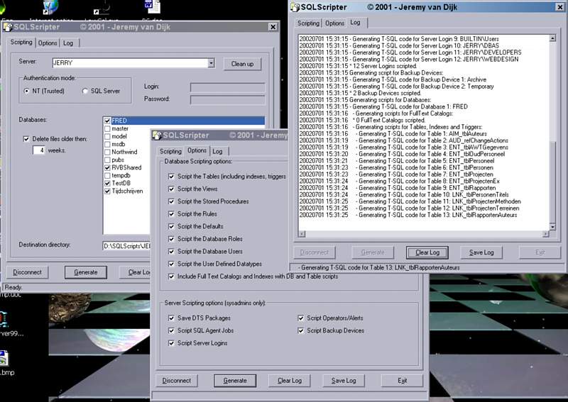 This little application uses SQLDMO to script out objects in SQL Server 7.0 databases (tables, stored procedures, views, defaults, UDTs, full text indexes, etc.), as well as SQL Agent Jobs, Server logins, Operators, Alerts and Backup Devices. It even lets you save DTS packages as Structured storage file. Can be run in GUI mode or unattended/scheduled from the command-line.