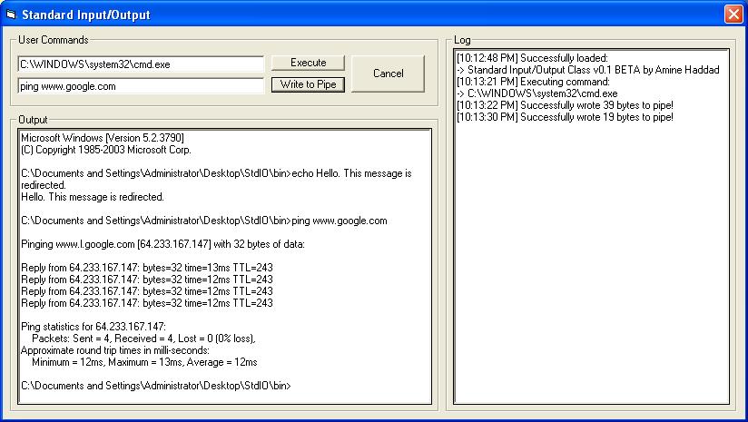 This program is one of a kind, and I don't say that because it can read output of another application but because, for the first time, it can send input from vb as well! Please, it took me a few days to code this, so if you like it, then please vote. I would also like to thank 2 friends of mine, Zak and Espen for their help in debugging this bloody program.