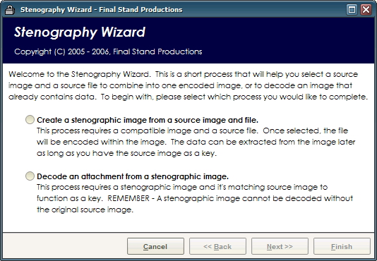 The Stenography Wizard makes hiding data in your images easier than ever. In three simple steps you'll be creating your own stenographic images and decoding them with ease. Simply select the source image and a file to hide in the picture to create a stenographic image. To decode an image, select the encoded image and the original source image and it'll seperate the hidden data stream and write it back to location on disk. Being a pure Visual Basic implementation it has several limitations - this software will only operate properly on a Windows XP operating system, and can only create BMP files. It will however load JPG and GIF files in many case for use as a source image. DO NOT UNDER ANY CIRCUMSTANCE Modify the encoded image - if the BMP palette becomes altered, or the color of any pixel is changed manually it will corrupt the encoded data stream. The data stream is also unrecoverable without the source image for comparison. The Wizard will automatically perform all of the necessary steps for selecting the most transparent encoding method.