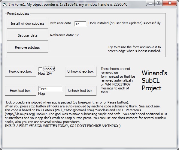 SubCL allows you to subclass windows while using breakpoints, Pause and Stop button in VB6 IDE. It's easy to use and safe (i hope). I combined Paul Caton's WinSubHook2">https://www.vbcoders.com/vb/scripts/ShowCode.asp?txtCodeId=51403&lngWId=1">WinSubHook2 and Karl E. Peterson's HookXP">https://vb.mvps.org/samples/HookXP/">HookXP (though it wasn't very easy to write ASM procedure:-)