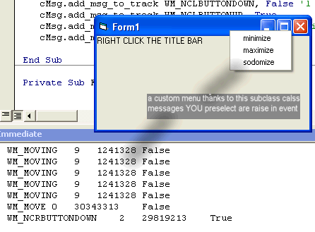This is a wonderful subclassing .dll for anyone but particulary the beginner or intermediate programmer or anyone who doesn quite have a full handle on subclassing but still wants to be able to use the awesome Free power of it. This class is extremely simple and straightforward to use and contains 2 properties and 2 methods and 2 events and has a small help file as well. This subclassing project also allows you to not only intercept, but choose to discard or keep the message. A very simple example is given to show you the awesome potential and power subclassing has.