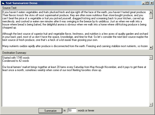 Included with this demo is an article from Seasoned Cooking magazine (seasoned.com). Try setting the maximum number of words to 100, 200, 300, and so on and see what you get. You can paste any text in you want. Be sure, though, that you help the engine out by putting one or more blank lines between any paragraphs, bullet points, etc.