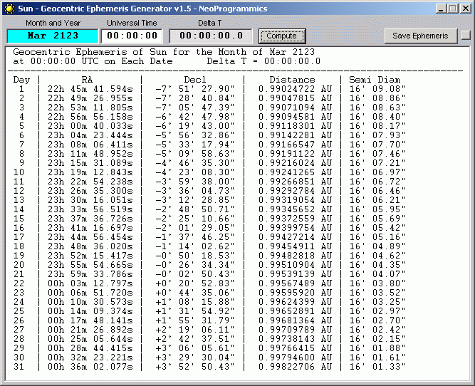 High precision ephemeris of geocentric solar coordinates over an 8000 year period.