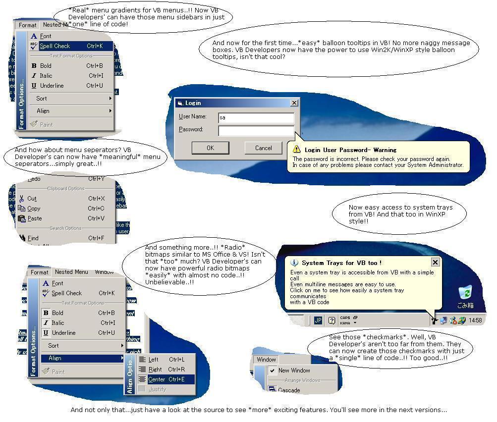 Well, now VB developers do not have to worry any more about API's for having custom menus, system information, system tray access, multiline and balloon tooltips. All are under *one* roof. Just a reference to a DLL to your VB project and that's it. With just one line of code, you can create *wonders* to VB code and that too very very professional.