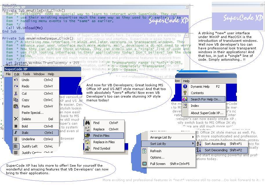 Well, now VB developers do not have to worry any more about API's for having XP style custom menus, translucent windows, system information, system tray access, multiline and balloon tooltips. All are under *one* roof. Just a reference to a DLL to your VB project and that's it. With just one line of code, you can create *wonders* to VB code and that too very very professional.