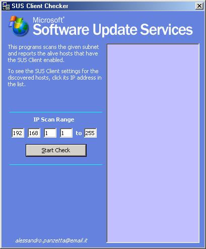 Given an IP address range, the program scans the network and checks if the connected hosts have the SUS Client enabled; if they have it, the program writes the discovered hosts in a list. To see the client settings of a given host, simply clicking it on the list, the program opens a window containing the SUS Client settings and gives the opportunity to change the SUS Client settings