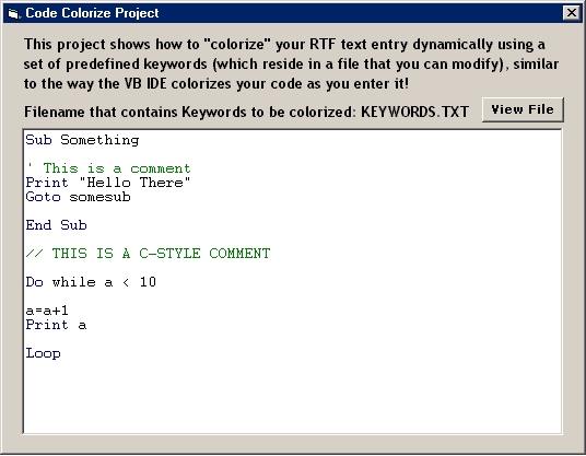 This projects shows how to convert an RTF box into a dynamic Syntax Colorizer (like the VB IDE colorizes what you type). It uses a text file to build its list of keywords (are you writing your own scripting language?), which you can easily modify by adding your own list of words/commands. Included is a small subset of the VB language syntax to show an example. Routines are very fast, and account for quotes, and comments. Routine also sets keywords to proper case ("print" to "Print" or "backcolor" to "BackColor". Hope this is helpful to some of you out there - I have commented it heavily to help you if you need to make modifications, or you can simply drop the "Colorizer" module into your own projects and use as is (simply pass your forms RTF box and the colors of your IDE you want).