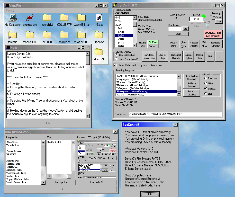 This is a program that will let you show, hide, alter text, capture a picture, change the parent, kill, close, enable, disable, get info on, minimize, maximize, restore, capture a picture of, make them stay-on-top, send a message to, edit the window style, and flash the title bar on almost any target! The target can be selected by dragging the mouse from a button to the target or by entering a HWnd! It includes many more features and a complete help system. It also will list all the programs running on your system, will allow you to change their priorities, and will give you info on them too. The program can also perform a screen capture and can even highlight HWnds directly on the screen! It is excellent to learn by, and it's code is thoroughly commented and clean. Also, I would be grateful for any votes you feel fit to give me. I would appreciate them a lot, believe me!