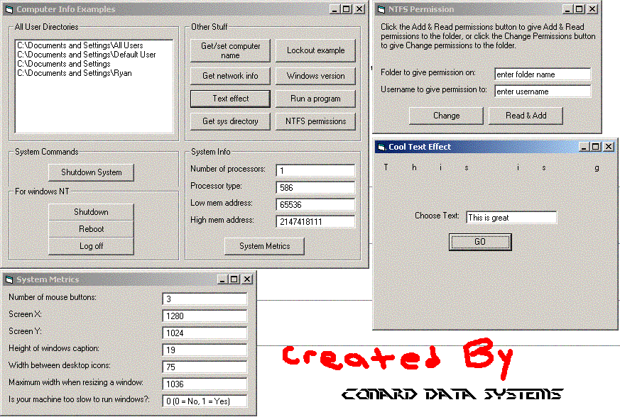 This is just a bunch of pure API code relating towards systems information. Some of it is useless and some of it is cool. I just threw it all together in one big example. See the screenshot to see what this program can do. Enjoy!