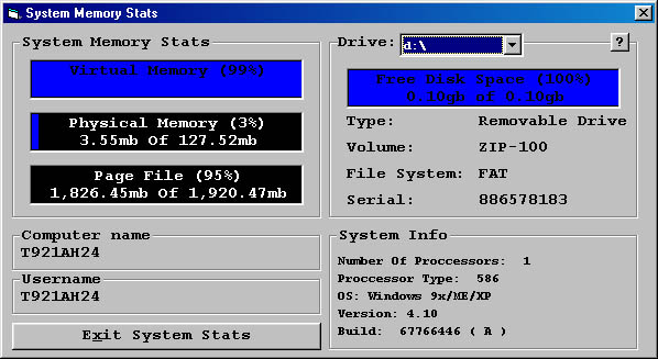 Virtual Memory, Physical Memory, Page File, Username, Computer Name, Disk Free Space, Drive Volume, Drive Serial, Drive File System, Drive Type, Number of Proccessors, Type Of Proccessor, Operating System, OS Version, OS Build. (OS Detection was brought to my attention to be incorrect... It has been corrected)