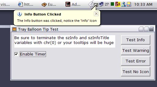Don't forget to vote. Balloon tooltips in the system tray the way MS does it in 2000/XP/Me. It uses the same method of putting the icon in the tray that we're all used to, but the NOTIFYICONDATA class has changed to reflect the balloon tooltip information. This is the first code i've seen on VBC that does this correctly. Vote if you like it. See the image ->