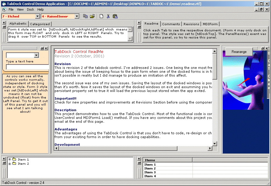 TabDock is designed to provide Docking support similiar to that seen in Visual Basic itself, VC++, and a number of other programs available on the market today. It was originally written by Marclei V Silva and though an excellent control it was somewhat on the buggy side and was missing a number of features.