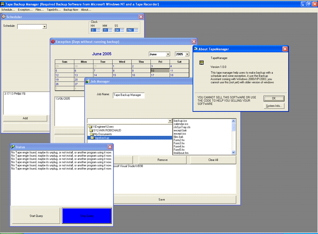 Did you ever use the backup assistant ( ntbackup.exe ) from Windows 2000/xp/2003 at work, and saw than the backup assist doesnt have anything to stop the backup job every holiday, its not a big thing you will say, but for me it is. If someone create something on the day before the holiday, and in the holiday someone delete that thing, if you dont change the tape you will loose that file, with this software you can stop the job on the holiday. First I thought maybe I could buy a software like veritas, but after I saw I could run backup assistant with the command prompt, and there is some api to help me for the tape status, so I started this on june 15th. Thing I need to do on that software, repair the montly stuff, make the exception windows more like the scheduler windows, make the software independant of the backup assistant (So I need to know how the API work for making a copy on a tape), I need to setup something to send an email when we need to change the tape, so I need to know how to manage multi tape, and the last thing, make my software a NT Services. All those thing will be done, if you can help me on something go ahead.