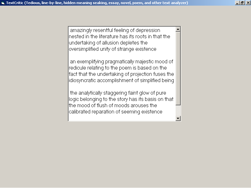 This is a simple program I wrote quite a while ago. Just double-click the textbox, and watch the "Test Critic" pretend to be smart, with long sentences like: "extravagantly underlining feeling of vivacity belonging to the text relates itself in that the feeling of finalization cavourts the erroneous validity of simplified being". Enjoy!