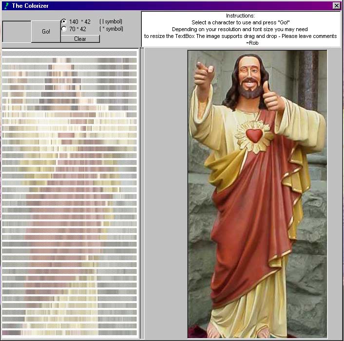 I had a very different idea of this program when I started but this is just as cool. It takes any image file (gif, jpeg, bmp) and converts it to text. I've tested it with Arial. You can enter a custom text pattern but you'll have to do a little bit of extra programming. Please leave comments. Thanks ~rob