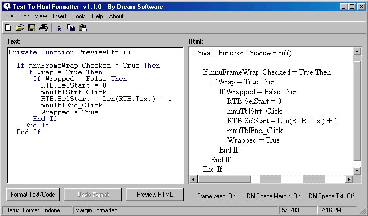 Website Submitters Must See. This Will Format Your Code/Text/Article/Tutorial Into HTML Format and save you heaps of time submitting your ideas trying to convert text or even code into HTML Friendly Format. Martin K. sent me a 'Tweaked' copy of v1.0.0 and I have continued work from there. Also added Color coded RTB, Frame Wrap, Insert Menu, Print option, Resize Text and WebBrowser windows (not form) with form drag Added VB.frm Filter to remove 'rubbish' from file while loading code Some nice bas added by Martin, also and credit to Will Barden for his RTB Color .bas. Please comment and vote!