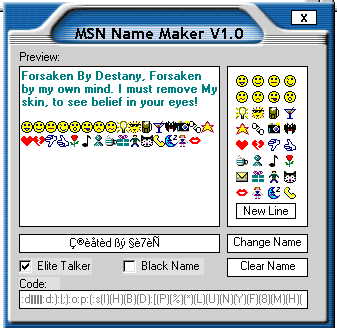 This is The Best MSN Name Maker Ever!!! No not really, I cant back that up. But its still pretty good. Easy to use GUI with Elite {see Screen Shot). The elite talker is NOT my code and I cant remeber the author. So Many thanx to the dude who submitted that. Please as always LEAVE A COMMENT!!! and it will be most appreciated. :o)