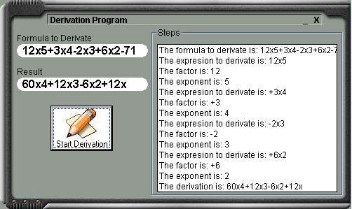 The purpose of this code is to make the derivation procedure. This code derivates a function (eg. 12x2+3x to 24x+3, for those who know how to derivate).