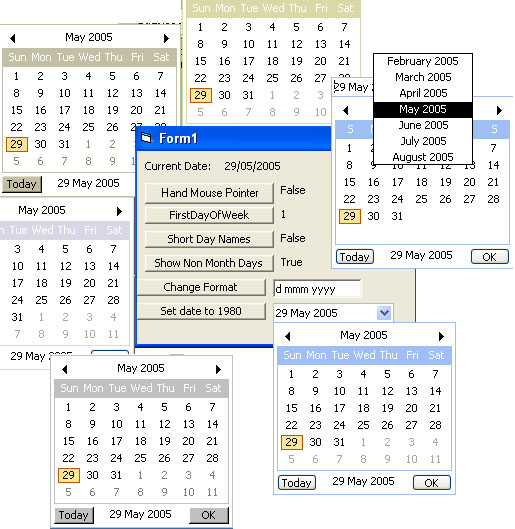 A datepicker. See screenshot. Supports themes, different date formats, hand cursor, short day names, non month days and first day of week assignment. The main advantage of this code is that it is a single usercontrol, not an OCX.