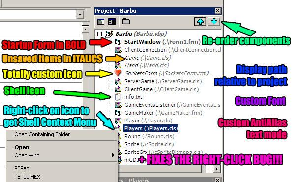 This VB6 Add-In gives you a bunch of special options for the IDE Project Tree. All options are configurable through a control panel (access through the AddIns menu). While there are a lot of enhancements, my absolute favorite is the ability to re-order the items in the tree. -----------------------------------