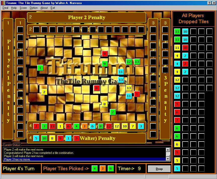 Tile Rummy Game a.k.a. "Tirumm" is a very addictive & interesting game that i coded last month of this year. The game rules of this game is very simple, all you have to do is create a series of combination of tiles in a group of 3 tiles with Straight Number but with similar colors or create a 3 same tiles with identical numbers. And the first player who finished dropping all tiles is the winner or if that didn't occur all players tiles will be counted and the winner is the one with the highest score according to player's all tiles value. IF YOU LIKE THIS CODE JUST VOTE FOR IT! Have fun!!