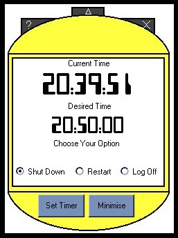 This program you can set up to shutdown or restart or log off your computer at set time (clock must ne 24 hour format), the best things is you can set your computer up to play mp3s at night and you can then set your computer to shutdown at a set time, if you have an atx power supply it will actually turn off your computer