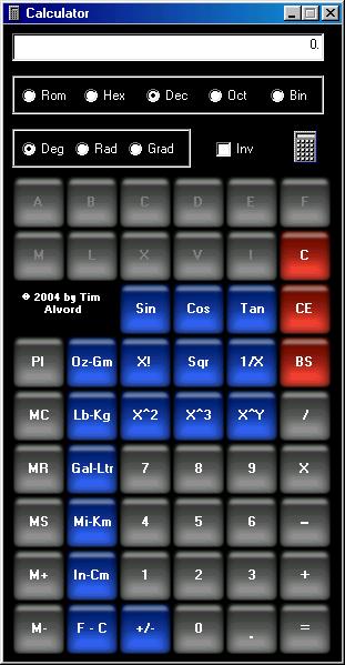 This program is a Simple Scientific Calculator. It handles Roman Numeral, Hex, Decimal, Octal and Binary numbers. Degrees, Radians and Gradians. All the standard Trig functions. Factorial, Sqr, Inverse, Square, Cube, X^Y. Fun conversions like Ounce <-> Grams, Pounds <-> Kilograms, Gallon <-> Litre, Mile <-> Kilometer, Inch <-> Centimeter and Fahrenheight <-> Celsius