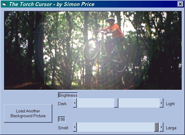 You'll love this! This is a cursor which interacts with a picturebox by lighting it up around the cursor position! Look at the screenshot. You can choose any picture you want, and the size and brightness of the torch can be chosen too! (Although larger torches run slowly). If you think this is cool/interesting/well programmed/original then please vote. The code is fully commented. Also look at my other submission of a transition special effect (look in best code of the month).