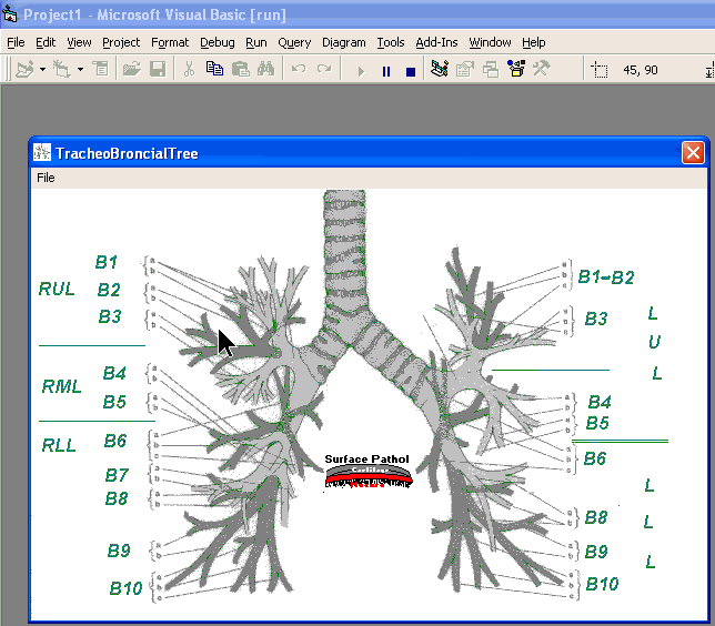 This is a graphic representation of the anatomy of your tracheobronchial tree (windpipe and airways) as viewed with a digital bronchoscope. This will eventually include the ability to record realtime findings and generate a report suitable for charting. At present it is only medically educational.