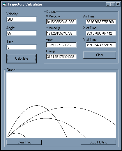 NOW WITH GRAPHING CAPABILITIES - I have been wanting to write a game like Cannons or Bang Bang for a while now, and haven't been able to find strong, simple, and correct calculations for ballistic trajectory. So, with a little search on Google.com, I found a few sites that show and explain the basics of ballistic trajectory calculations. I then transcribed the information i needed from the mathmatical libraries to code. All of the functions are broken down into very simple and uniform chunks. It is also in a single, easy to read module. Included is a simple example of how to utilize the functions inside the module. I hope this can help someone with aspirations like mine. Questions or comments can be directed to be via e-mail at [email protected]