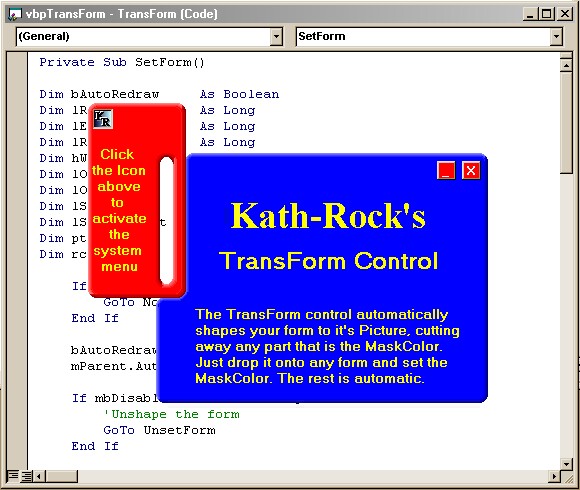 This UserControl will take the existing Picture on any form and cut out the form wherever the MaskColor is found. This method is MUCH quicker than the pixel by pixel region creation I've seen on several sites. Features an AutoDrag property to allow the form to be dragged without a titlebar. Also features a PopupSysMenu method to activate the form's system menu at specified coordinates. No need to remove your Titlebar, TransForm cuts that out too, but it's still visible on the taskbar if you want. Comes with full source code and a demo project.
