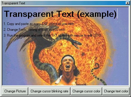 You can use the transparent text with "Microsoft Forms 2.0 Object Library" - "FM20.DLL", but there is one problem: this ActiveX component is not recommended to use, and it'll work only on computers with Microsoft Office 98 or late installed.